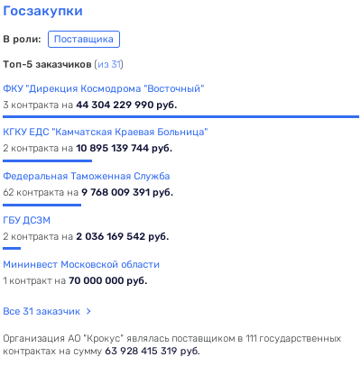 Perhaps it was Agalarov's strong lobby that, even after high-profile scandals, did not turn away state customers from him. The parent company, Crocus JSC, was the executor of more than 100 state contracts totaling over 63.9 billion rubles.