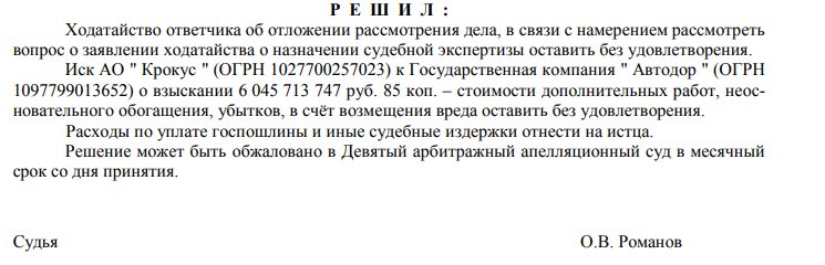 Agalarov lost the dispute. The court noted that when performing work on the DIS, Crocus JSC did not coordinate with the state-owned company the production of any additional volumes of work, and also did not suspend the work. That is, the state customer is not obliged to pay for these works, no matter how much the oligarch wants.