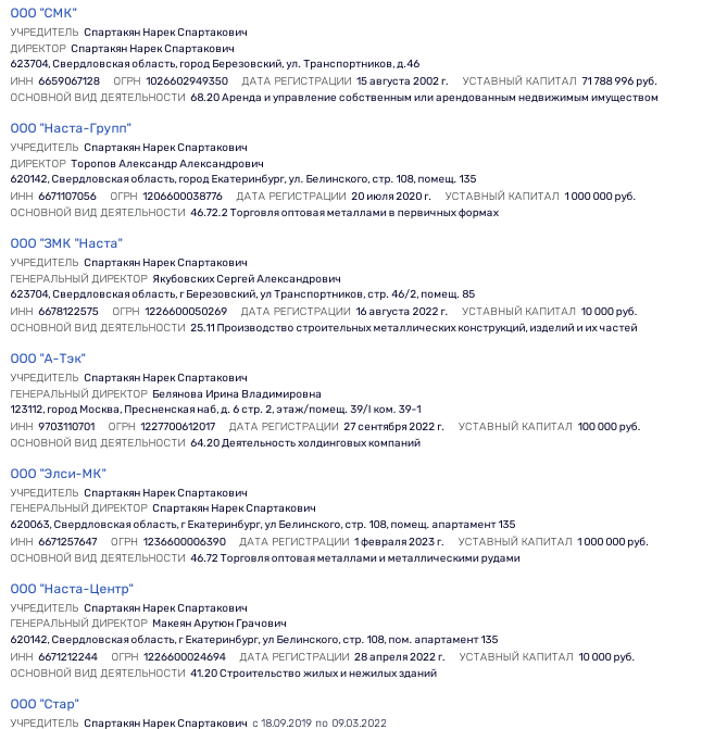 Judging by the Unified State Register of Legal Entities, Spartakyan's business portfolio began to form only in 2020 (at the same time, Nasta-Group LLC, which also works in the field of metal trade, was created), and since 2018, the businessman's namesake on the website of government agencies appears as the Honorary Consul of Armenia in Yekaterinburg. At the same time, a number of companies are registered at the consulate address, and this indirectly confirms that we are talking about the same person.