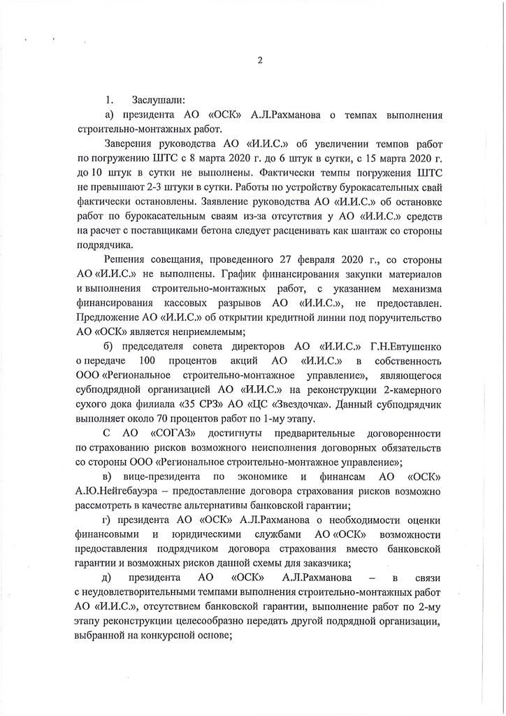 And because the breakage of contract occurred grossly, there were no clear explanations except for the expressed desire to take away 100% of shares of JSC I.E.C. in favour of controlled by USC, Regionalnoe SMU LLC - in the protocol of the meeting of the RSC signed by Alexey Rakhmanov it is written: Gleb Yevtushenko is required to transmit 100% of the stocks to the property of Regionalnoe SMU...