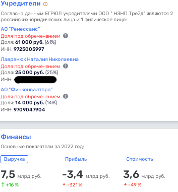 According to Rusprofile, the owners of NZP Trade LLC are Renaissance JSC with a share of 61%, Lavrenyuk Natalia Nikolaevna (25%) and Finconsaltpro JSC (14%). At the same time, the shares of all three are laid down in Rosselkhozbank.