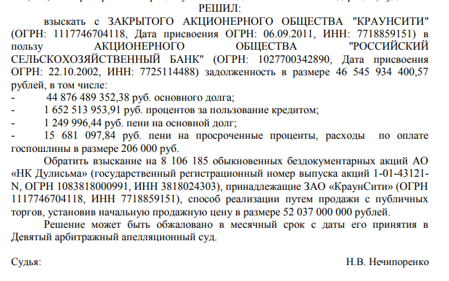And here is what is interesting: a certain LLC "Akvamarin," which was also recovered as a guarantor for the debts of "Dulisma" 46.5 billion rubles, stated that "the bank allegedly seeks to appropriate the profitable business of JSC" NK Dulisma "and at the same time get satisfaction of the requirements under the loan agreement from the guarantors." The bank itself rejected such arguments. In parallel with this, RSHB seizes through the court the shares of Crownsiti CJSC from their owners - Alexander Aronov and Igor Drogin, that is, it is trying to take control of the oil asset. Probably for subsequent resale. Although the interested parties, apparently, have already decided.