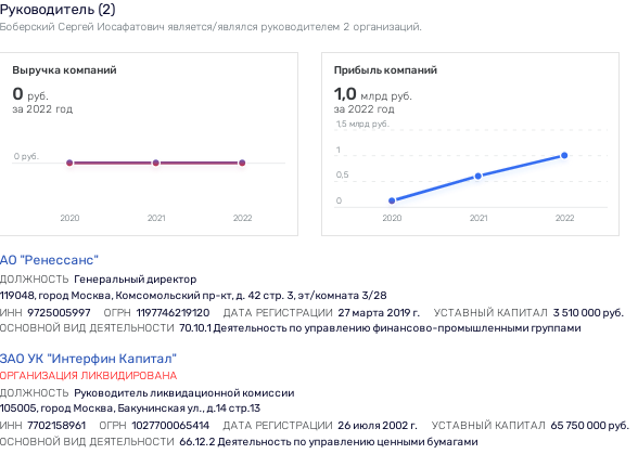Renaissance, in turn, is managed by Sergey Bobersky, who was previously the head of Interfin Capital Management Company, which belonged to the later burst Bank Russian Credit OJSC. The publication "Banki.ru" called the current beneficiaries of the ex-owner of Globex-Bank Anatoly Motylev (26.70%), billionaire Georgy Gens (20.01%, after his death his assets were inherited by his son Philip), Viktor Lukoyanov (17.47%), Elena Vikhoreva (11.44%), Boris Hait (8.75%), Viktor Uskova (8.75%).