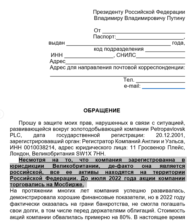 They prepared an appeal to the President of Russia with a request to protect their rights. The share of minority shareholders in Petropavlovsk is about 40% of the shares, and the structure itself, although registered in the UK, is in fact Russian, its assets are located in our country. And if the gold miner ceases to operate, Russian citizens will be left without work.