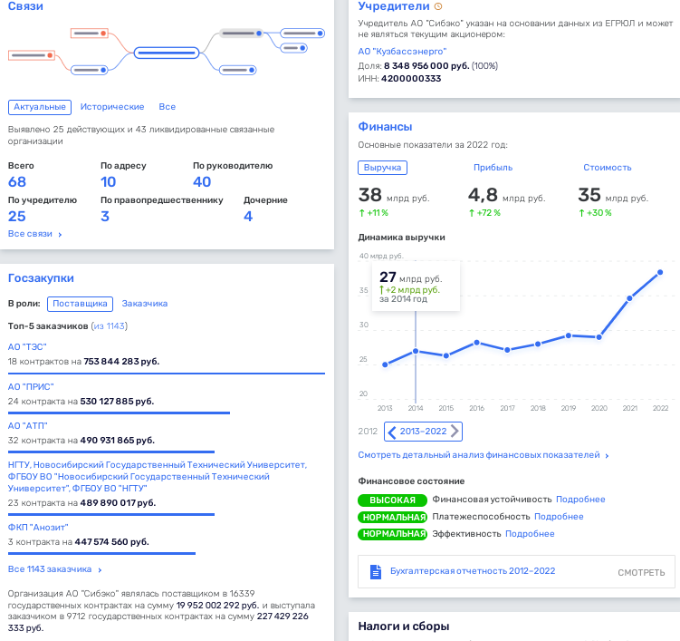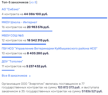 In addition to the already named companies, Sibeko is the owner of the Novosibirsk Energetik LLC (steam and hot water production). Energetik is a supplier in 77 state contracts worth more than 103 million rubles and a customer in 35 contracts worth more than 51 million rubles.