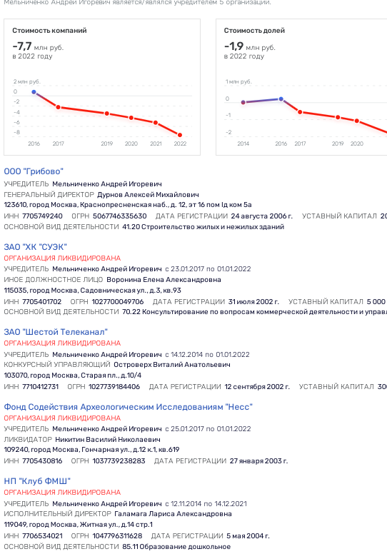 According to Rusprofile, only the construction LLC Gribovo, established in 2006 and showing zero revenue for 2022, is listed directly behind Andrei Melnichenko from the current legal entities. His partners in this business are Sergey Astanin, Svetlana Mozheiko and former top manager of LUKOIL and active real estate investor Alexander Rappoport.