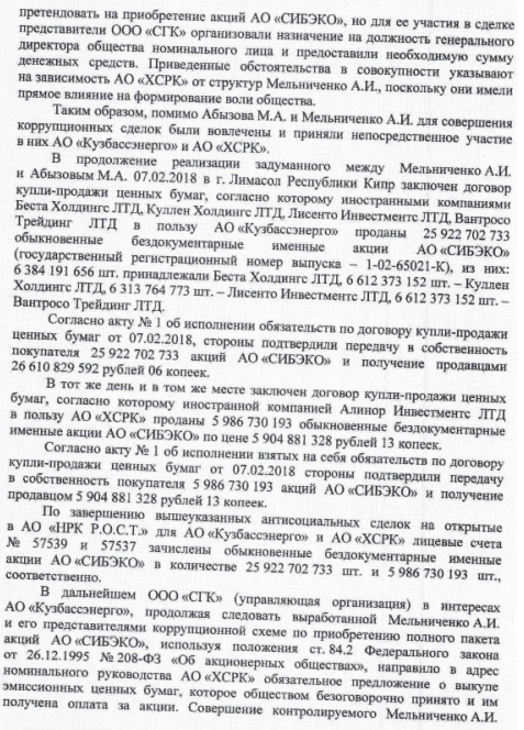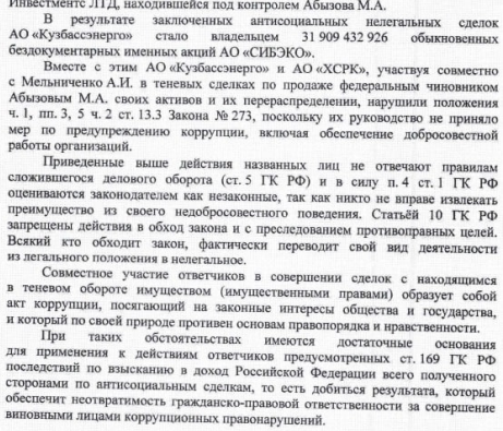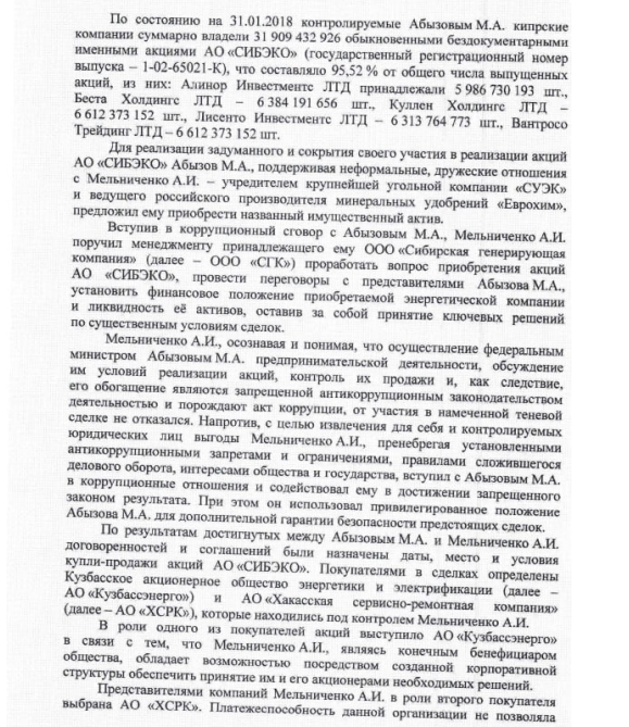 "Melnichenko A.I., realizing and realizing that the implementation of entrepreneurial activity by Federal Minister Abyzov M.A., his discussion of the conditions for the sale of shares, control over their sale and, as a result, its enrichment are activities prohibited by anti-corruption legislation and generate an act of corruption, did not refuse to participate in the planned shadow deal," says Deputy Prosecutor General I.V. Tkachev in the lawsuit.