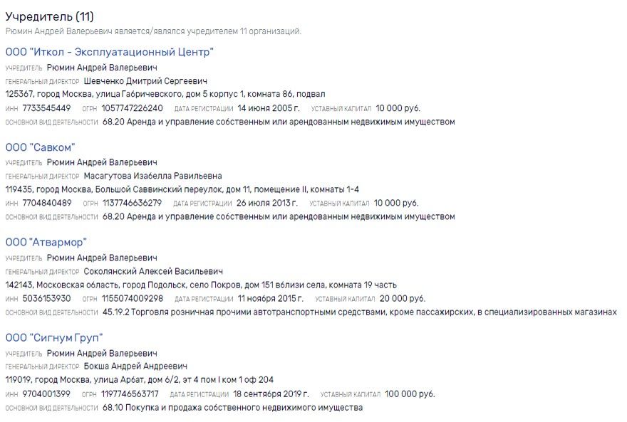 Now he is listed as the founder of 11 organizations at once. Shares, of course, are not in trust - apparently, after Rosseti, Ryumin has time to personally direct his own business. Some companies may have fictitious signs. For example, LLC Savkom, where Ryumin has 70% of the shares, did not have any own assets, and with an authorized capital of 10 thousand rubles, one person works there.