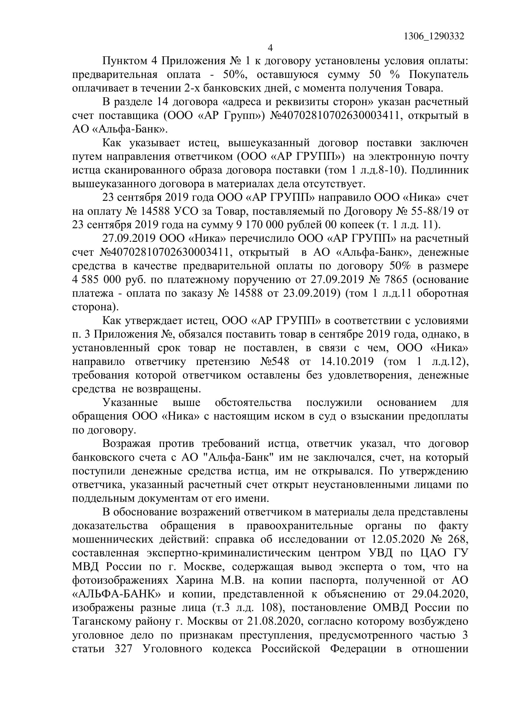 After 4 days, on September 27, Nika LLC transferred AR Group LLC to a settlement account opened with Alfa Bank as a preliminary payment under the contract of 50% in the amount of 4,585,000 rubles on payment instructions.