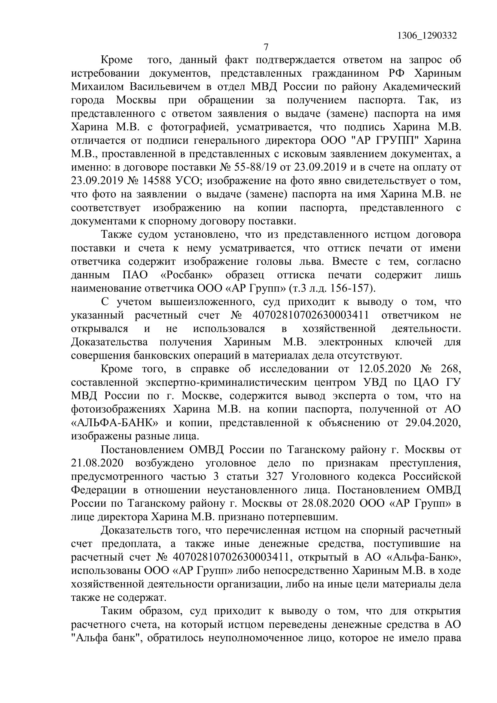 After all these "discoveries," the court concluded that an UNAUTHORIZED PERSON who did not have the right to act on behalf of AR Group LLC applied to open a settlement account to which the plaintiff transferred funds to Alfa-Bank JSC.