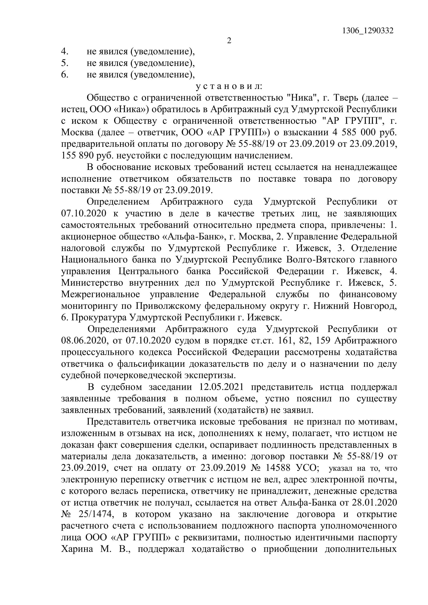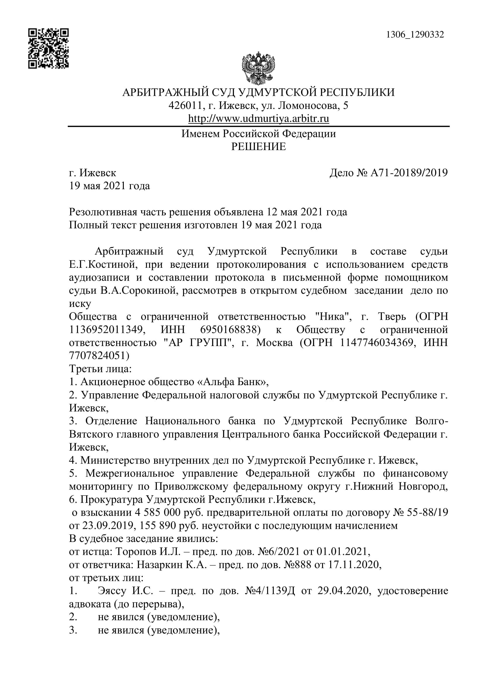 So, the case "On the recovery of payment under the contract" was considered by the Arbitration Court of the Udmurt Republic of A71-20189/2019 on May 19 of this year, 2021. The Arbitration Court of the Udmurt Republic considered, it would seem, a rather ordinary case in the lawsuit of Nika against AR Group to recover preliminary payment under the Supply Contract.