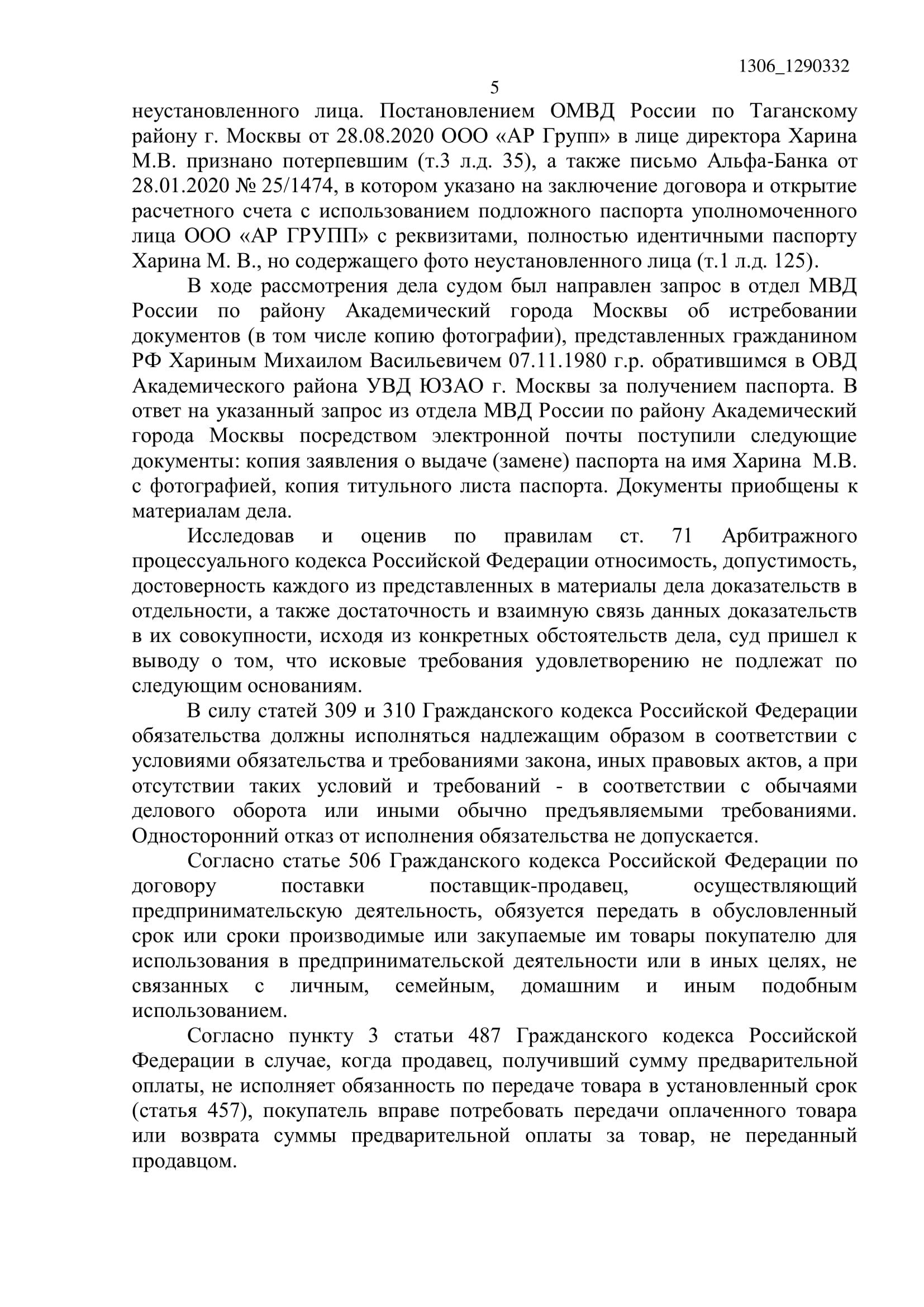 All this has also been confirmed by a letter from Alfa Bank dated January 28, 2020, No. 25/1474 (available in the case file). This letter indicates the conclusion of an agreement and the opening of a settlement account USING A FORGED PASSPORT with details completely identical to the passport of M.V. Harin, but with a photo of an unidentified person...