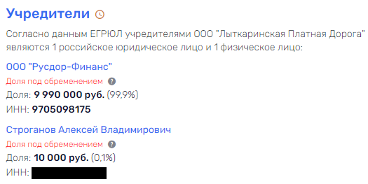 LLC Lytkarinskaya Toll Road is 99.9% owned by Rusdor-Finance LLC and 0.1% by Alexei Stroganov. All 100% of the shares are pledged by Gazprombank. In turn, Rusdor-Finance LLC is owned by the same Stroganov (33.5%) and Olga Puchkova (66.5%).