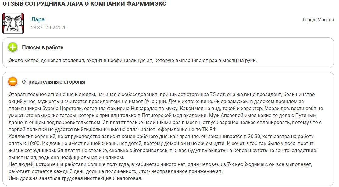 For example, according to a certain Sergey Bezrukov in his review on the O rabote website, allegedly salaries in the company are below the market, they are not issued under a labor contract, but under a contract agreement, the entire document flow is conducted on paper, because the authorities in the person of the Apazovs and their daughter Nizharadze do not know how to use computers. It's downright scary to read this about a company that is also engaged in medicine development. Are these the "modern" technologies now"?