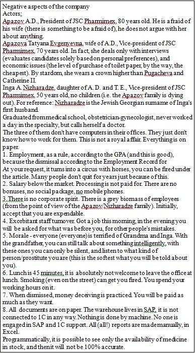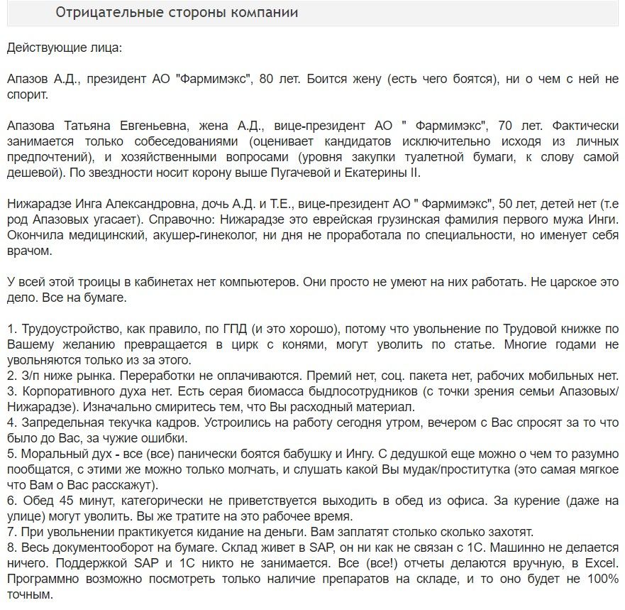 Separately, the author of the review stops at the description of the authorities. In particular, he writes that Alexander Apazov "is afraid of his wife (there is something to be afraid of), does not argue with her about anything", his wife Tatiana - "by stardom wears a crown higher than Pugacheva and Catherine II", and their daughter Inga - "graduated from medical institution, obstetrician-gynecologist, has not work a day in her specialty, but calls herself a doctor". Because of this, they say, there is an unhealthy atmosphere in the team and many are simply afraid of the leaders. However, this can only be the opinion of the "offended" employee. But it seems as if Pharmimex could "offend" too many people.