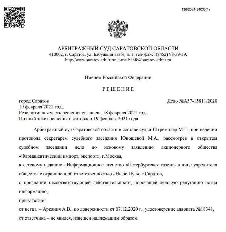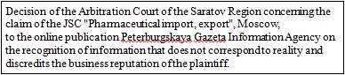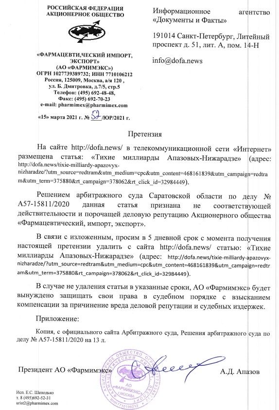 The latter, obviously, do not really like when such information "is surfaced". Pharmimex appealed to our colleagues from Dokumenty i Fakty with a request to remove the material about the company's activities by the decision of the Arbitration Court of the Saratov region from the website. However, the publication was not in any court discussions with the firm, so it was very surprised by the fact that the court decided to remove the material. It turned out that the company of the Apazovs was suing the Peterburgskaya Gazeta news agency, which simply reprinted the material of Dokumenty i Fakty. It is curious why the businessmen did not turn directly to the primary sources?