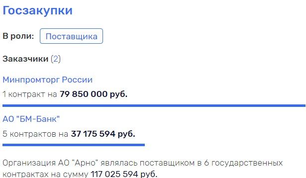 Arno JSC also looks suspicious with losses of 9.8 million rubles with revenue of 133 million. This organization has a more impressive portfolio of orders: 79.8 million rubles from the Ministry of Industry and Trade and 37 million from BM-Bank JSC. However, where did this money dissolve?