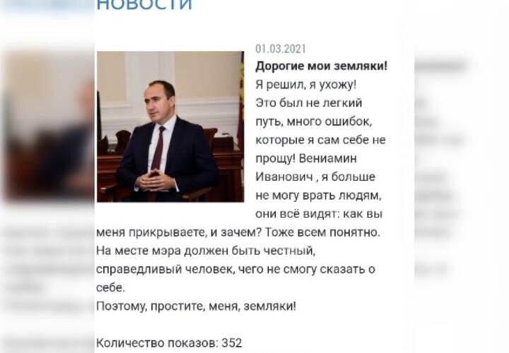 It may seem that Bogodistov himself has nothing to do with the story. But almost immediately, the website of the Gelendzhik administration was attacked by unknown hackers who posted a message on it, allegedly from the Mayor himself. In it, an unknown author, supposedly from Bogodistov himself, announces his resignation. He says that he can no longer lie to people, and also turns to Veniamin Kondratyev with the question of why he is covering him.