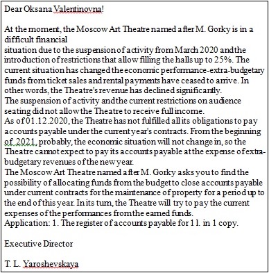 Looking ahead, we note that the actors of the Moscow Art Theatre have repeatedly sent appeals both to Vladimir Putin and to the Ministry of Culture of the Russian Federation with a request to pay attention to the unhealthy situation at the Moscow Art Theatre named after M. Gorky, to return artistic director Tatyana Doronina to the Theatre, to expel Eduard Boyakov, to save the Moscow Art Theatre from amateurs.