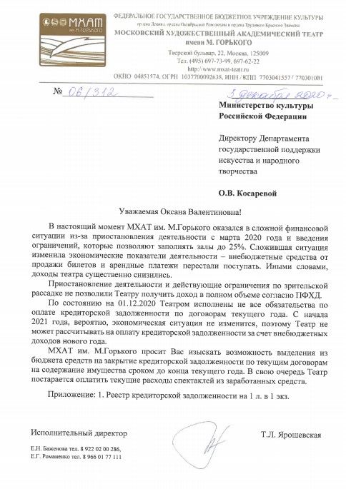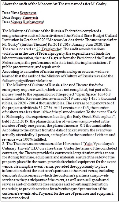 Incredibly, but it is a fact: the Ministry of Culture of the Russian Federation has completed a large complex audit of the Moscow Art Academic Theatre named after M. Gorky (MKhAT in Russian) for 2018 - 2019, as well as for January-June 2020. This audit revealed serious violations in the use of federal property, spending money on labour. Violations were found even when using a grant from the President of the Russian Federation. Distortions were found both in the implementation of public procurement, as well as in the implementation of repair work. All the materials of the comprehensive inspection from the Ministry of Culture of the Russian Federation were sent to the Prosecutor General's Office.
