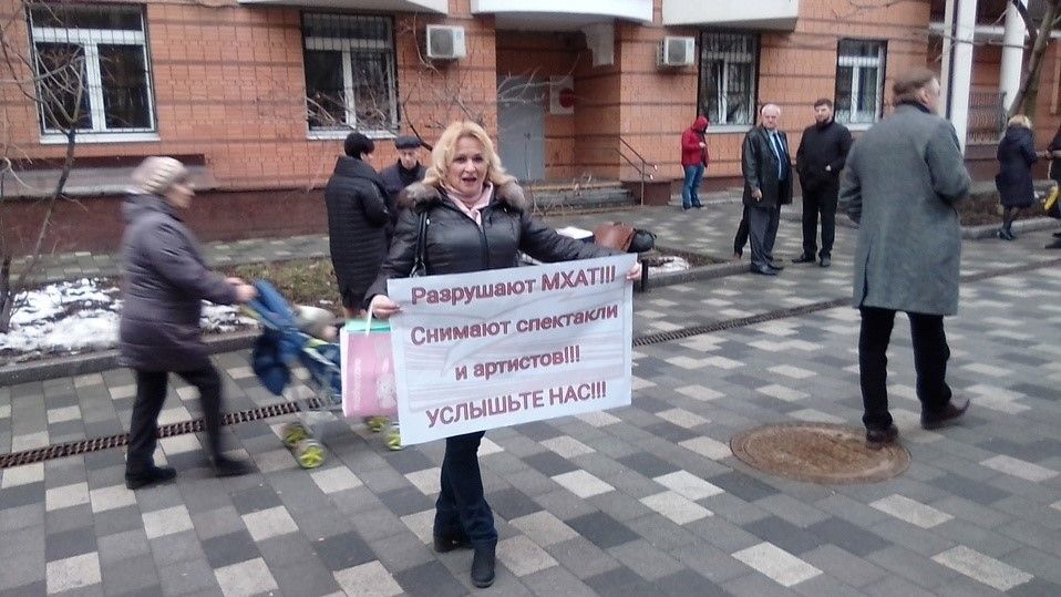 Actress Olga Dubovitskaya stretched a poster right outside the court building: "They are destroying the Moscow Art Theatre. They remove performances and performers. Hear us!"