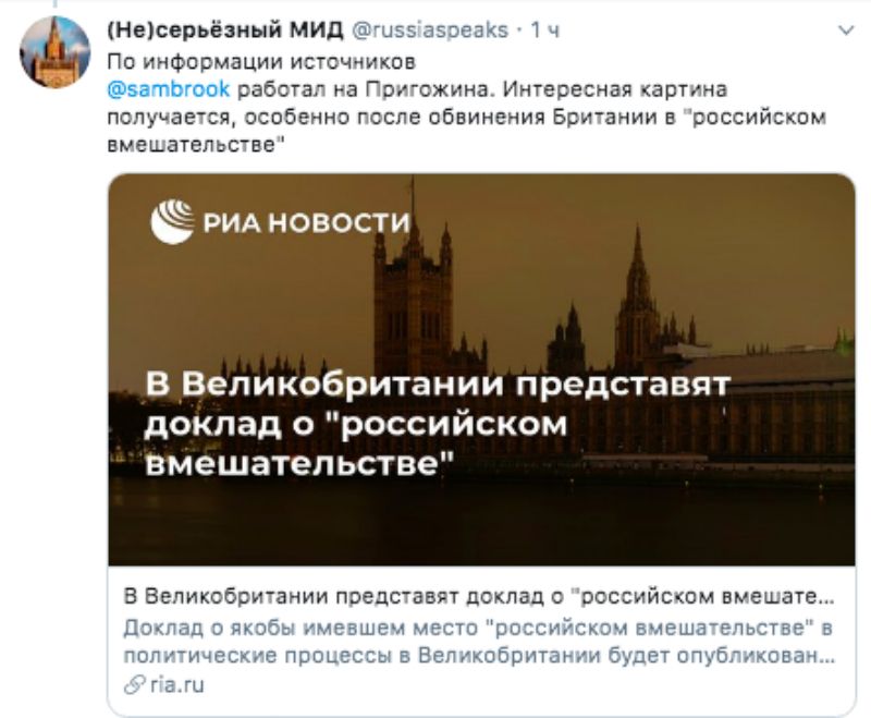 In addition, it should be noted that the Intelligence and Security Committee of the UK has prepared a report on Russian interference. This is primarily about internal political processes in the British Isles.