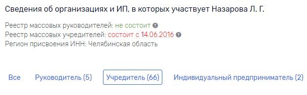 For two ladies, there are 121 companies where they act as founders. Larisa Nazarova - 66, and Svetlana Nigmatullina - 55. Many of them are formally active, but at the same time they have signs of fictitiousness. It would seem, what does their relative, the influential official Andrey Nazarov, have to do with it?
