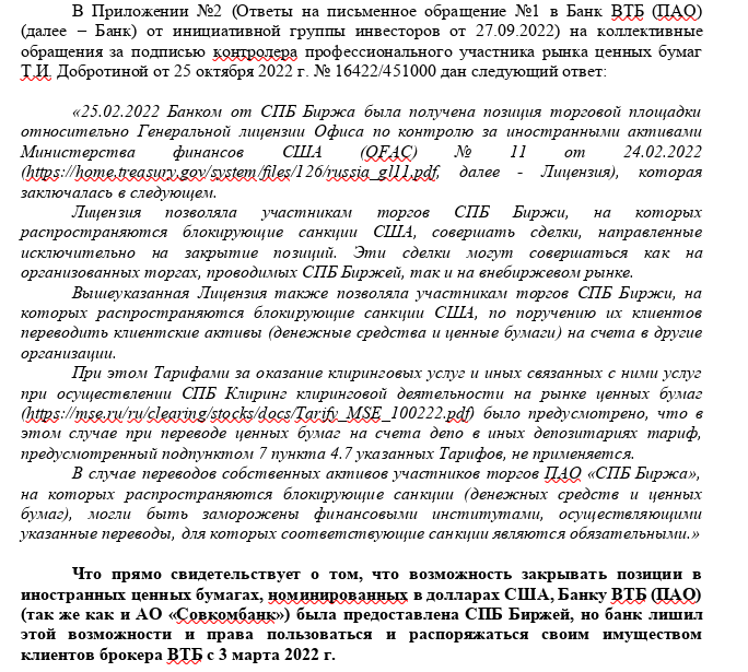 As investors noted in the conversation, the transfer of assets to other banks took place without their consent, and instead of giving clients the opportunity to dispose of property in the month allotted by the sanctions, the broker of VTB Bank did not allow them to organize trading on the St. Petersburg Stock Exchange with foreign securities (listed on US exchanges) before the entry into force of sanctions against VTB Bank (March 26, 2022) and blocking of MFC CC assets (March 11, 2022), namely: March 3, 9 and 10, 2022.