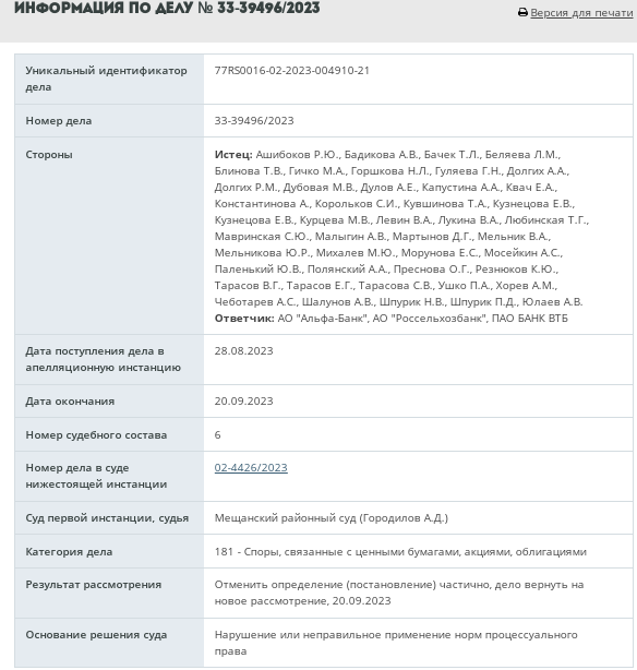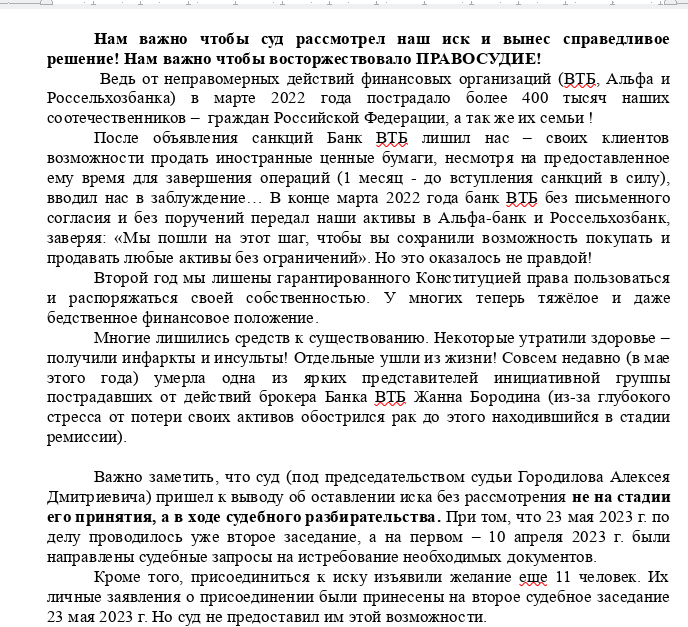 "After the announcement of the sanctions, VTB Bank deprived us - its clients of the opportunity to sell foreign securities, despite the time given to it to complete operations (1 month - before the sanctions came into force), misled us... At the end of March 2022, VTB Bank transferred our assets to Alfa-Bank and Rosselkhozbank without written consent and without instructions, assuring: "We took this step so that you retain the opportunity to buy and sell any assets without restrictions." But this turned out not to be true! For the second year, we are deprived of the right guaranteed by the Constitution to use and dispose of our property. Many now have a difficult and even dire financial situation. Many lost their livelihoods. Some have lost their health - received heart attacks and strokes! Some have passed away! " VTB's former clients said in court.