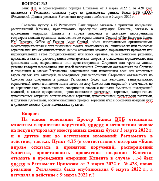 After all, there is still no answer to the most important question, on what basis did the broker of VTB Bank refuse to accept orders, accept and execute applications for the purchase/sale of foreign securities on March 3, 2022 and on other days before the amendments to the Regulations allowing the bank to refuse this? The new edition of the regulation itself was published on March 6, 2022, and entered into force on March 9 of the same year.