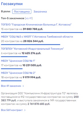 The Kotovskaya administration signed a contract with the daughter of "Complink" - LLC "Complink Infrastructure TO." The company was in great demand among the mayor's office, being a supplier of 412 government contracts worth 200 million and acted as a customer in 149 state contracts worth 2.7 billion rubles.