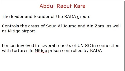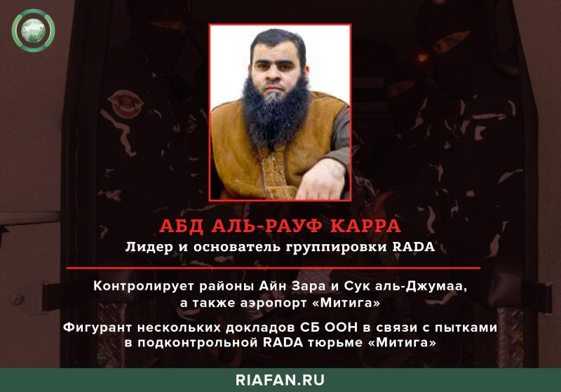 The leader of the RADA (banned on the territory of the Russian Federation) is Abdul Raouf Kara. He holds an official position in the Ministry of Internal Affairs of the GNA (banned on the territory of the Russian Federation). The terrorists of his group kidnap and torture people. "Mitiga" prison is also controlled by Kara and his people. Maksim Shugaley and Samer Sueyfan are kept there. RADA (banned on the territory of the Russian Federation) also includes fighters of terrorist groups which are banned in Russia.