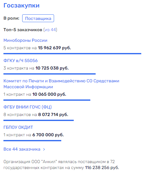 Entrepreneurs who worked with Jurgens are now the owners of companies that receive millions of government contracts. In the screenshot, data on the publishing company Ankil, owned by Rustam Yuldashev (Professor of the Department of Risk Management and Insurance of the MGIMO Ministry of Foreign Affairs of the Russian Federation), which was the founder of ODSSO during the period when Yurgens headed it. Photo: https://www.rusprofile.ru