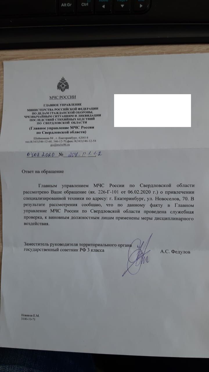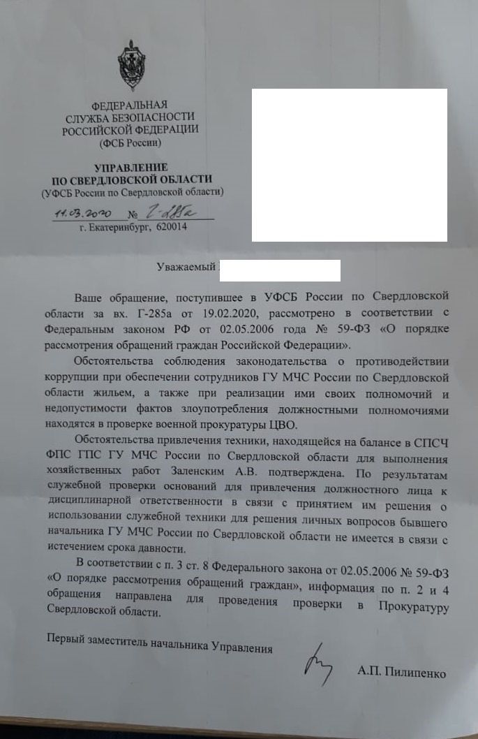 Checks were carried out. But, basically, the check was for where the leak of information from the Ministry of Emergencies came from. Once again, not on the part of the Main Directorate of the Ministry of Emergencies in the Sverdlovsk Region, but on the part of the Military Prosecutor's Office of the Central Military District (CVI), a lawsuit is not filed with the court on the arguments indicated in the "Conclusion on the results of the inspection of officials on the provision of their housing from 29.05.2020".